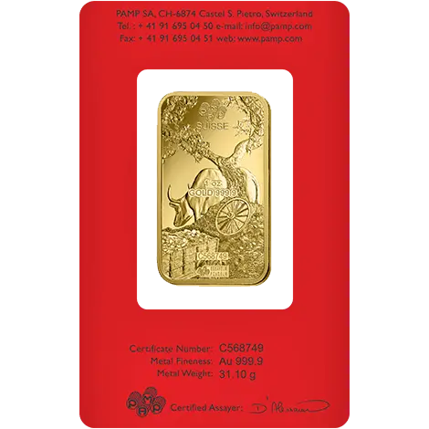 1 once Lingot d'Or - PAMP Suisse Lunar année du bœuf