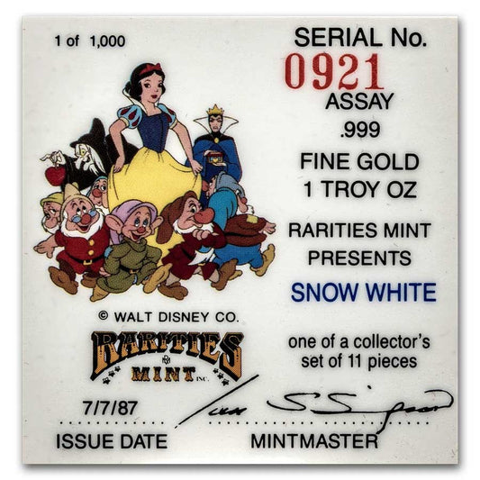 Pièce d'or ronde de 1 oz - Blanche-Neige 50e anniversaire (Blanche-Neige, avec boîte et certificat d'authenticité)