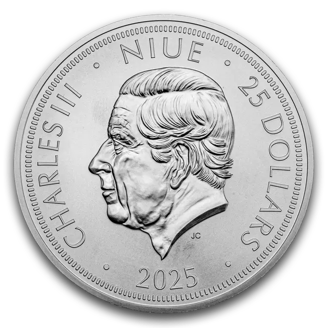 - Avers : Présente le portrait du Roi Charles III accompagné des inscriptions « NIUE · 25 DOLLARS · 2025 », confirmant son statut de monnaie légale.