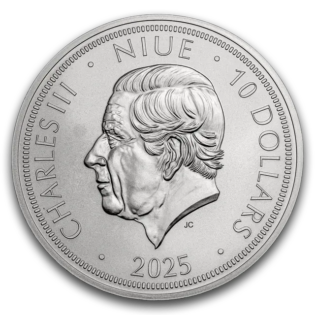 - Avers : Présente le portrait du Roi Charles III accompagné des inscriptions « NIUE · 10 DOLLARS · 2025 », confirmant son statut de monnaie légale.